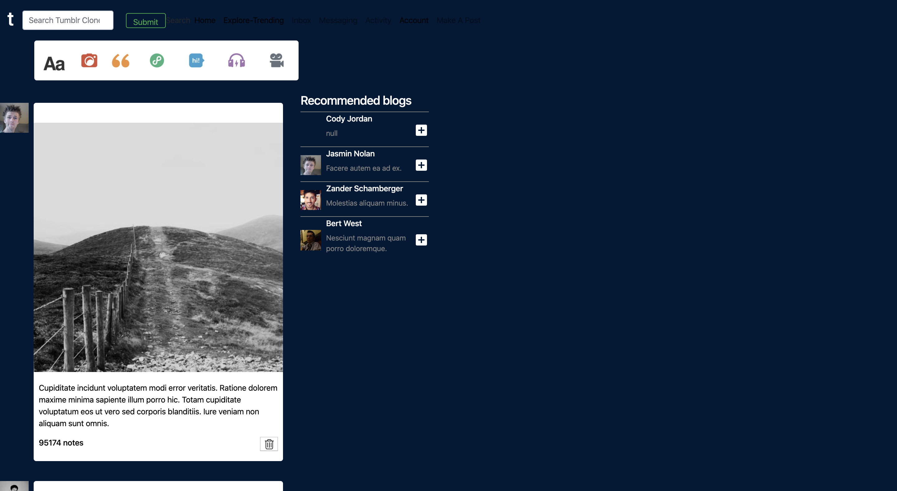 I contributed to the creation of a clone of Tumblr using back-end technologies such as Express.js, Node.js, PostgreSQL, Knex.js, and Passport.js